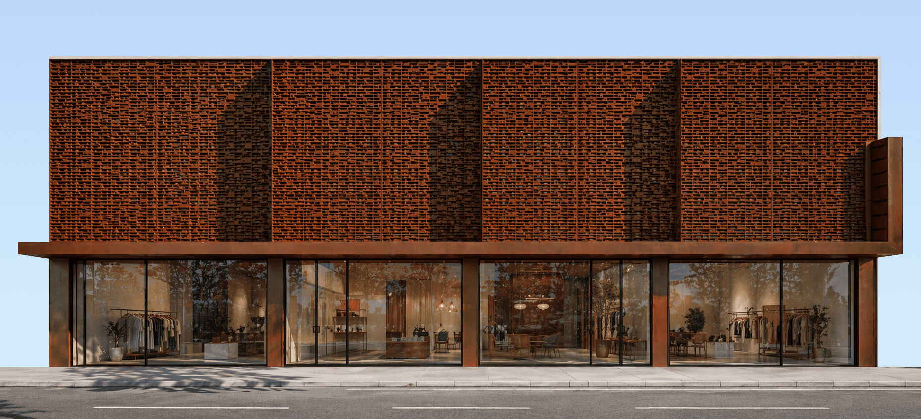 Les dispositifs d’entrée sont renforcés et mis en valeur, tandis que des éléments ajourés de teinte type acier Corten apportent une écriture architecturale plus légère et lumineuse.